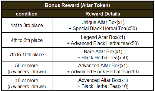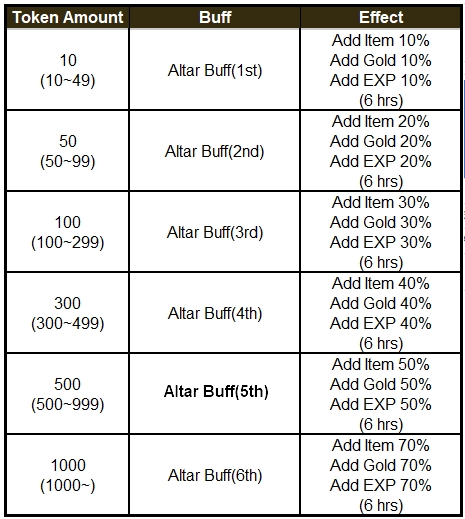 Atenção! ※ O buff do Altar pode ser recebido uma vez por dia por conta. ※ O buff do Altar não acumula. ※ O Token do Altar não desaparece após receber o buff. ※ Após o fim das vendas (17/12), o Token não poderá ser obtido e será deletado.