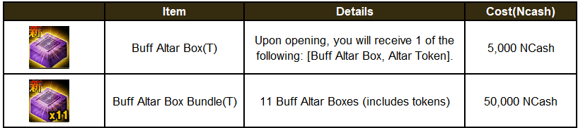Atenção! ※ Ao abrir a Caixa Altar de Buff, você receberá uma das caixas: Normal, Avançada ou Rara (alguns itens com baixa taxa de drop). ※ Após o fim das vendas, o [Token do Altar] não poderá mais ser obtido pelo item. ※ O item [Token do Altar] será deletado após o fim das vendas. ※ O Token do Altar é um item não negociável.
