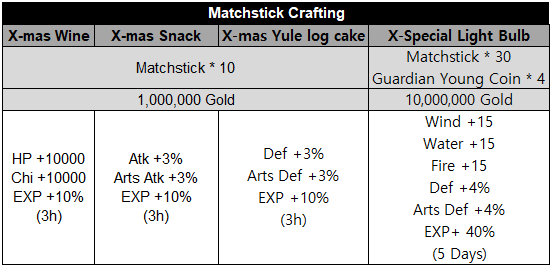 Durante o evento, os jogadores podem levar Fósforos ao NPC Velho do Natal e criar valiosos itens de buff.